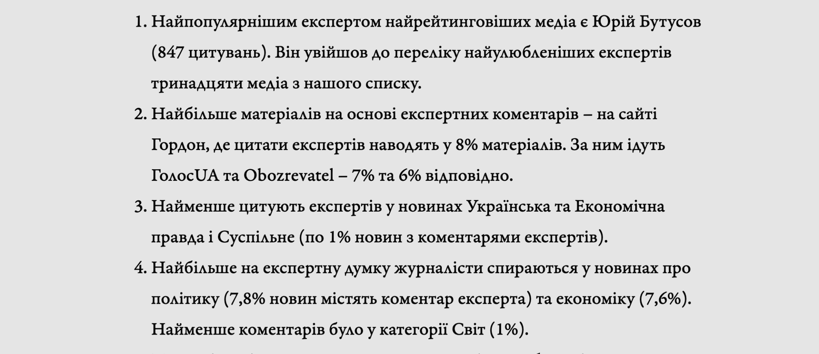 “... на сайтах найпопулярніших онлайн-медіа країни з’являються в середньому по 123 новини. Осягнути такий об’єм інформації важко, розібратися в кожній темі – неможливо. Тому часто журналісти звертаються до експертів, які пояснять читачам ситуацію, а самим журналістам допоможуть глибше зрозуміти тему та додати контексту до матеріалу.” – пояснює причини популярності “експертів” Вокс Україна.