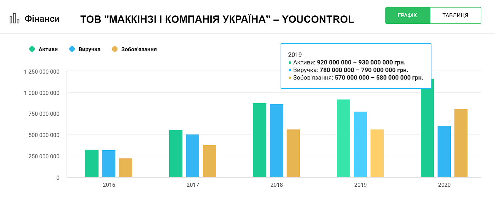 YouControl фіксує виручку цієї компанії за 2019-й рік – 22 млн грн. Погляньте на складність зв’язків діаграми і водночас на простоту гри. Виручка – 23 млн грн, а зобов’язання бідні, наче церковні миші.