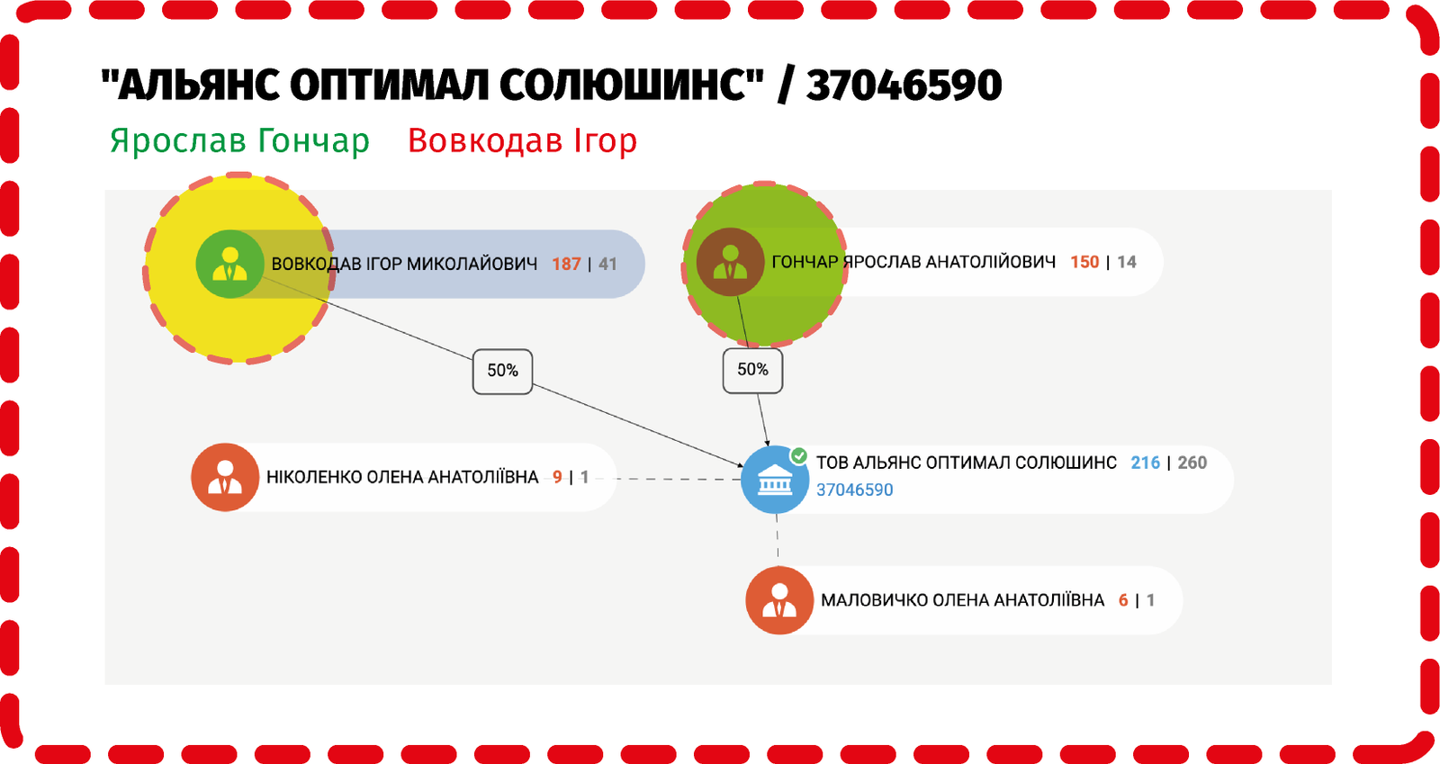 Проте навіть всевидяще око YouControl лишилося нечутливим до реальних родинних зв’язків Ярослава Гончара. Це не дивно. Платформа лише розвивається, поступово нарощуючи функціонал та поліпшуючи точність. Вона не завжди відображає всю потрібну інформацію. Для повноти картини доводиться вручну досліджувати багато деталей. Приміром на сторінці результату перевірки контрагента Ярослава Гончара позначені його близькі родичі.